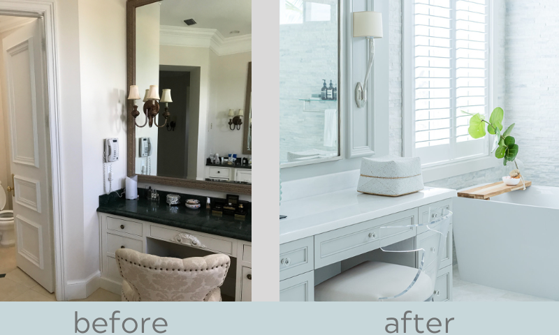 With this project in Highland Beach, Florida, I chose a satin finish on the wall moldings, cabinets, and shiplap to create a stylish and sophisticated look, not too shiny and not too dull. This selection worked perfectly in conjunction with the natural textured stones on the back wall and throughout. Check out this before and after of this project. If you’d like to talk design, contact me at kelly@kellymarieinteriordesign.com