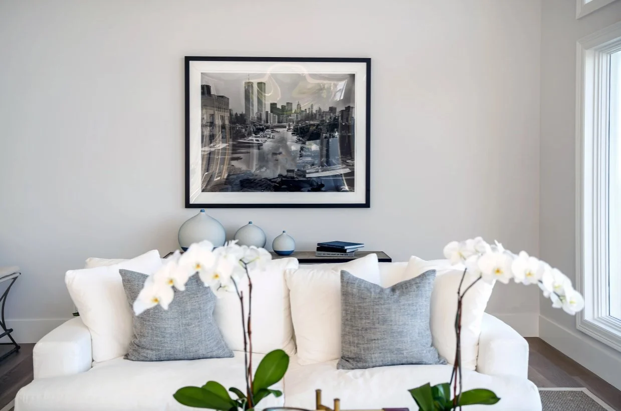 Be sure to add depth to your spaces by layering textures to create visual interest. This could be a couple of accent pillows, a throw, art, accessories, or greenery. Pick one color other than your base and use different shades of the same color, sprinkling it throughout each room when possible. This technique keeps your scheme simple and consistent, creating a tone-on-tone design.